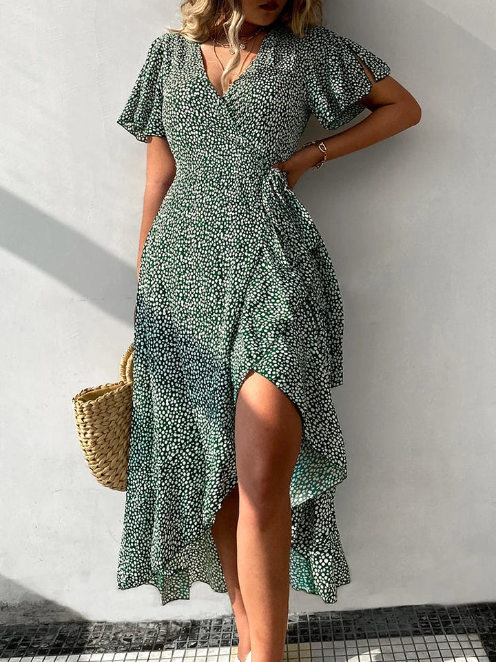 Flared Short Sleeve V-neck Wrap Tie Beach Dress