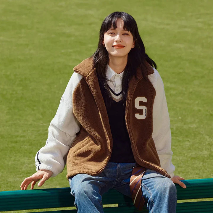 Imitation Lamb Fur Color Block Loose Letter Jacket