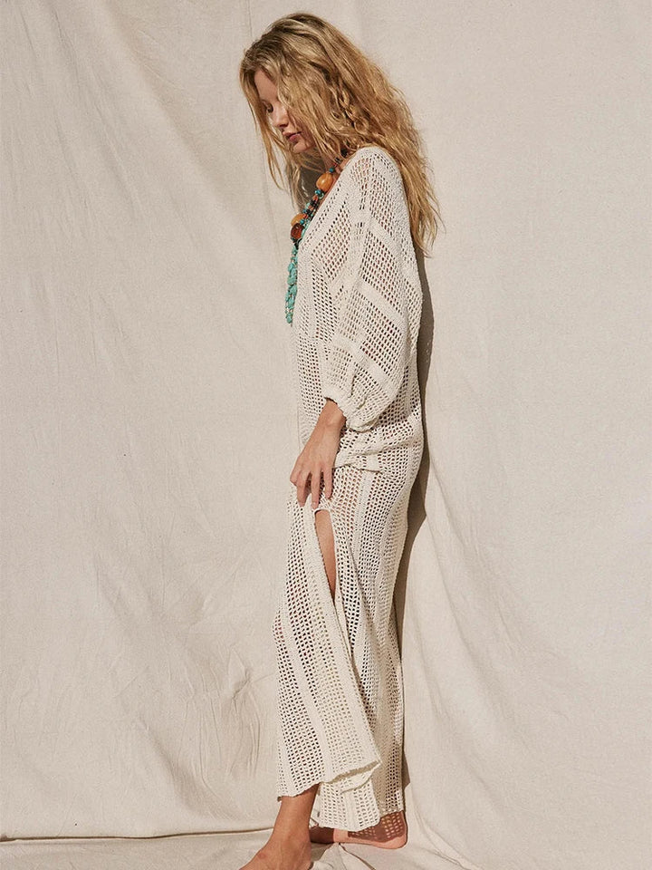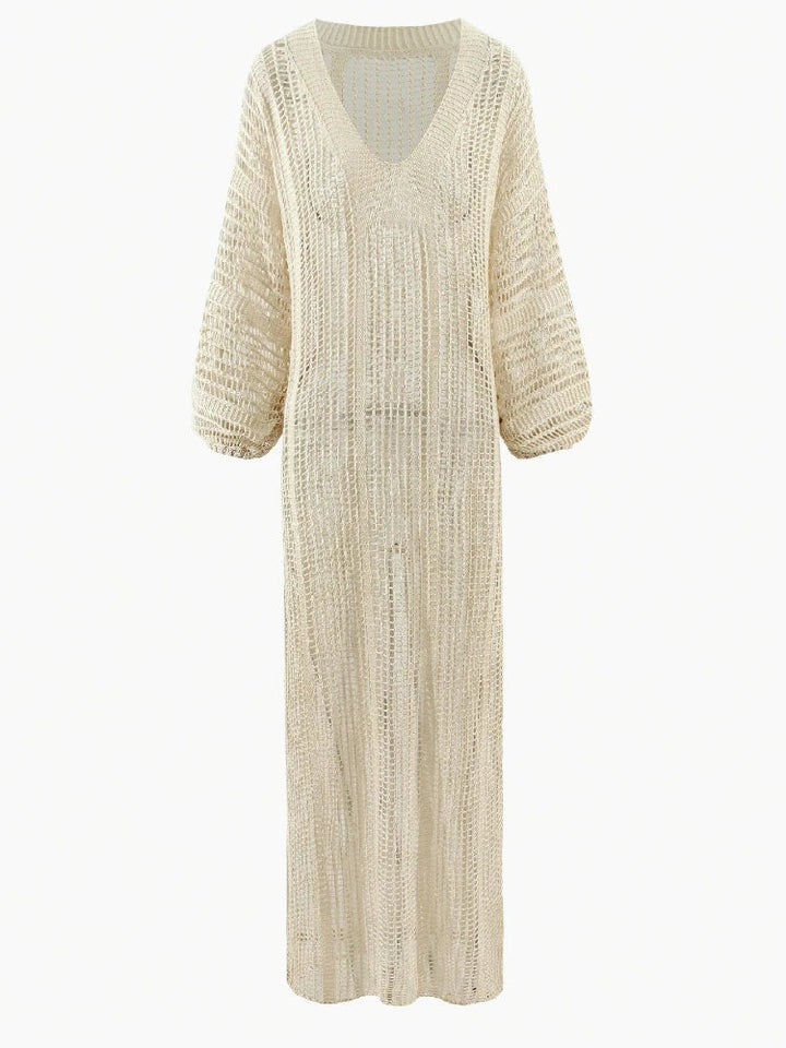 See-through V Neck Lantern Sleeve Side Split Beach Maxi Dresses