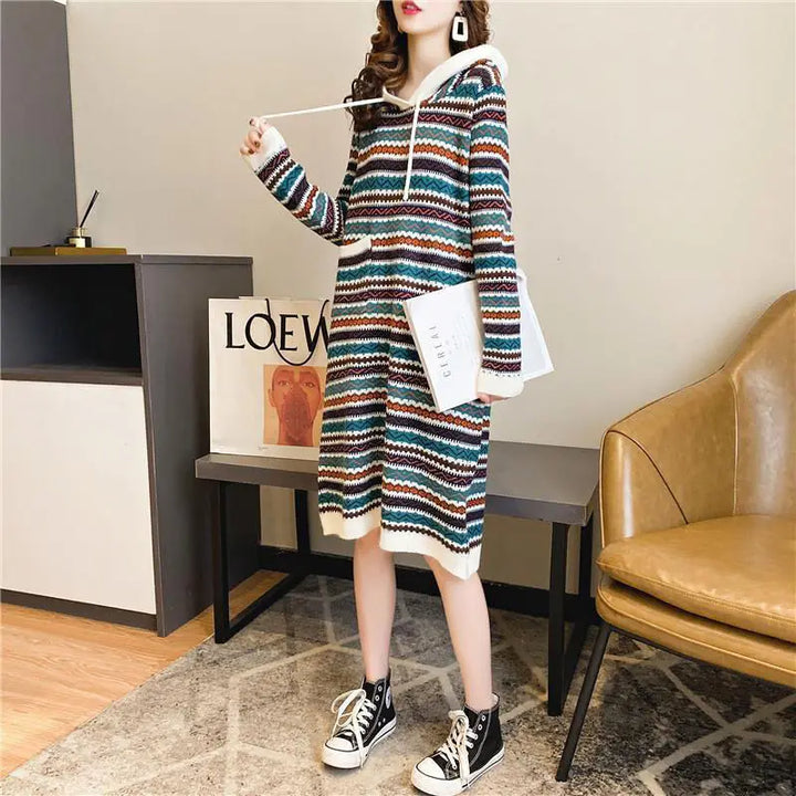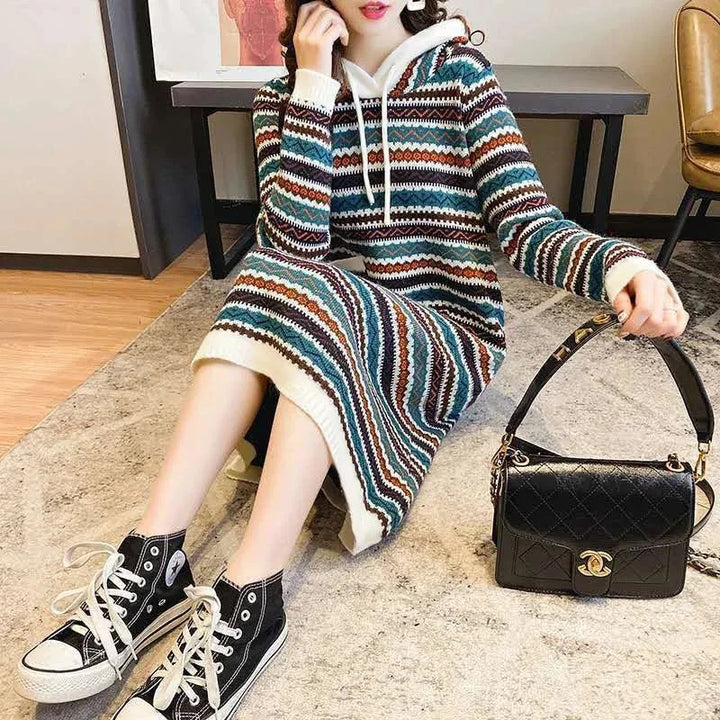 Oversized Striped Knitted Hooded Dress
