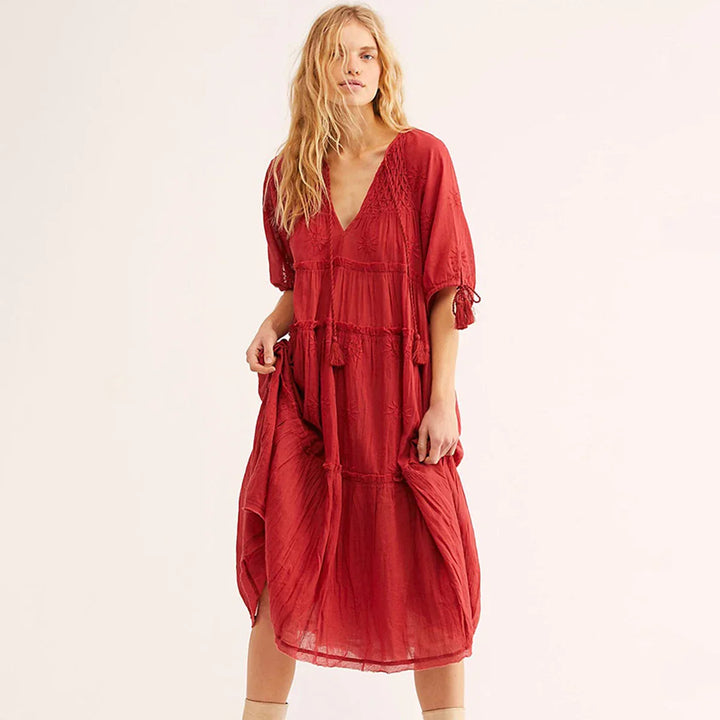 V-Neck Half Sleeve Vintage Boho Loose Cotton Dress